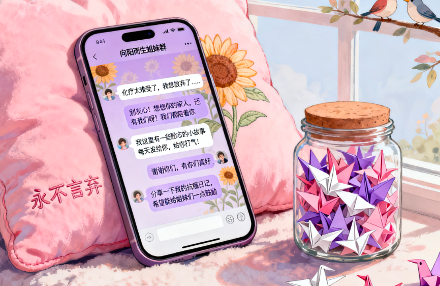 乳腺癌治疗不仅是个人的战斗,更需要全社会的关怀。在加入乳腺癌病友群聊后,你会发现,自己并不孤单,有许多人和你一起努力。这个群体中的每一份经验、每一句鼓励,都会为你的康复之路增添更多信心和力量。